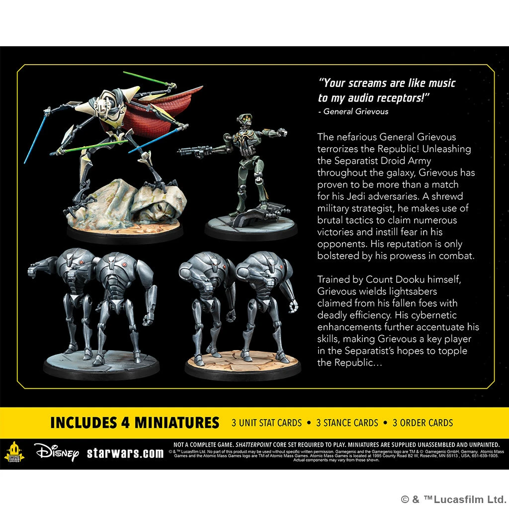 The nefarious General Grievous terrorizes the Republic! Unleashing the Separatist Droid Army throughout the galaxy, Grievous has proven to be more than a match for his Jedi adversaries. A shrewd military strategist, he makes use of brutal tactics to claim numerous victories and instill fear in his opponents. This pack adds a new squad of General Grievous, Kraken, and two B2 Battle Droids to Star Wars: Shatterpoint that players can play right away or use alongside other characters to create their own custom squad. In addition to the beautifully sculpted miniatures of all four characters, players will also find all the stat, order, and stance cards they need to bring these characters to life on the tabletop.