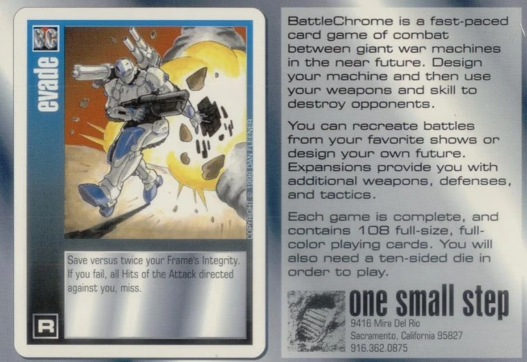 1996 card game of futuristic mecha battles in the 21st century. Anime-style art credited to “Dolphin Meat”, “Hunger”, “Bud”, Scott Roberts and “Sledgehammer”.