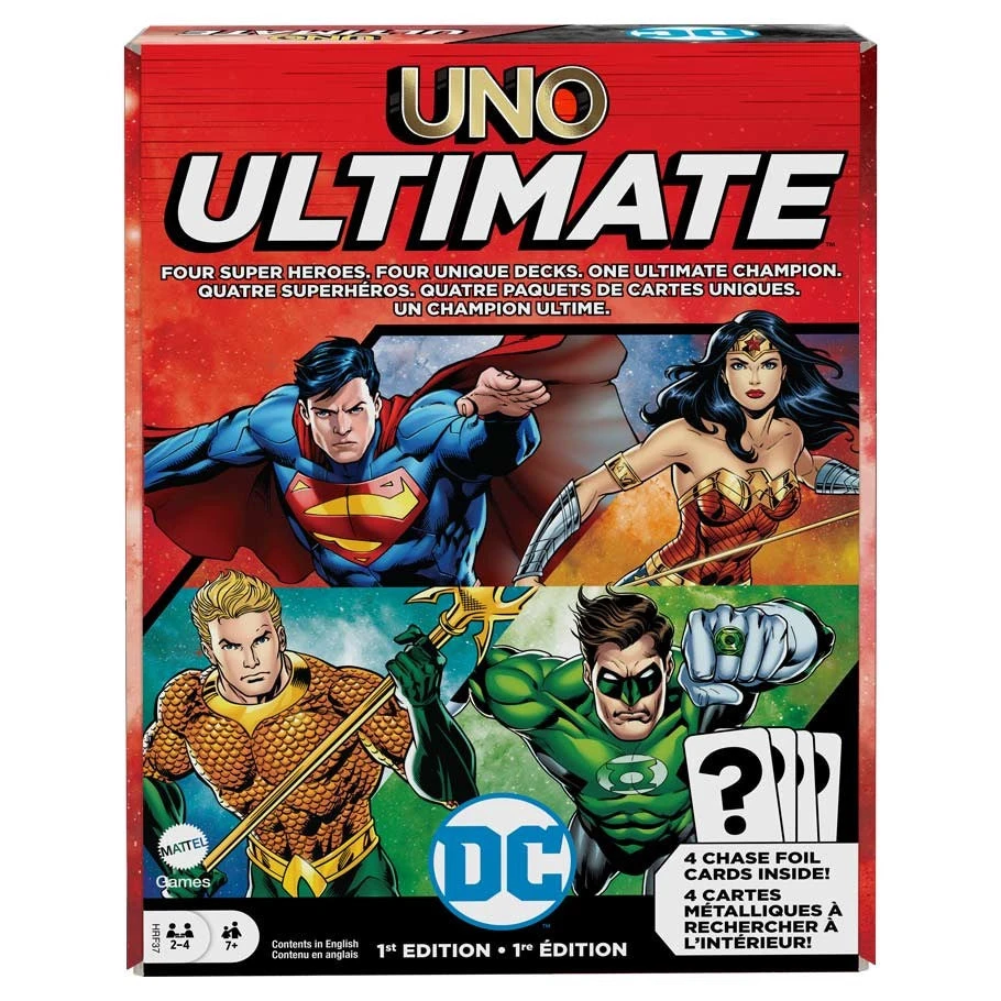 Play like a DC Super Hero™ with this With this UNO Ultimate™ card game! This premium version of UNO® features four card decks, each designed specifically for a popular, heroic character.