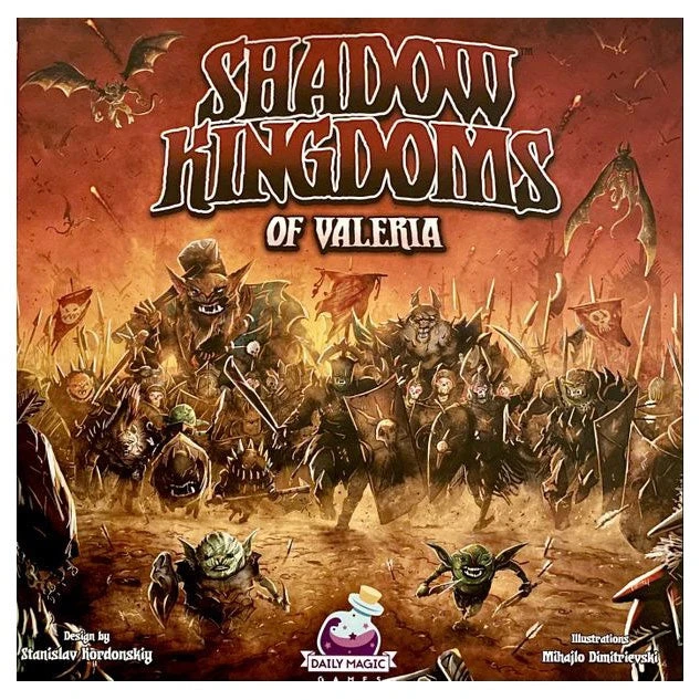 You are a Warden hungry for the destruction of Valeria. You must outwit the other Wardens to earn the right to command an army for the Shadow Kingdoms. Visit dark Shrines to gain minions, magic, gems, and gold to fuel your war machine. Command monsters into battle to conquer the lands and earn Victory Points. The player with the most Victory Points at the end of the game will be declared the winner.