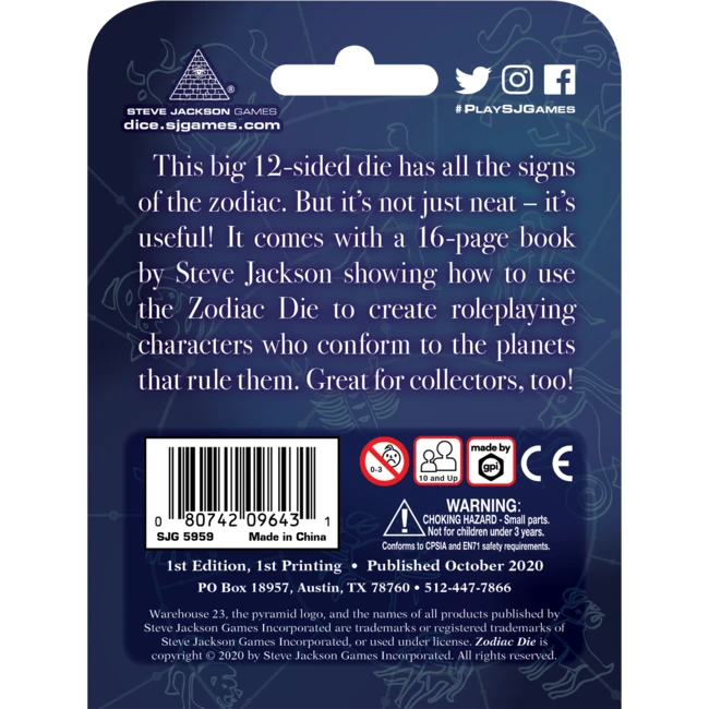 This big 12-sided die has all the signs of the zodiac. But it’s not just attractive – it’s useful! It comes with a 16-page booklet by Steve Jackson, showing how to use the Zodiac Die to create personalities for your roleplaying characters.